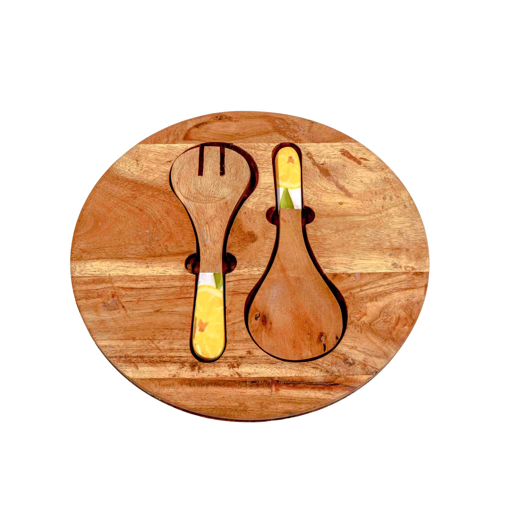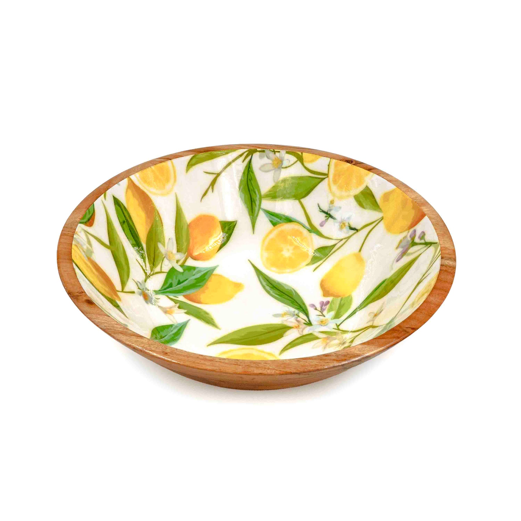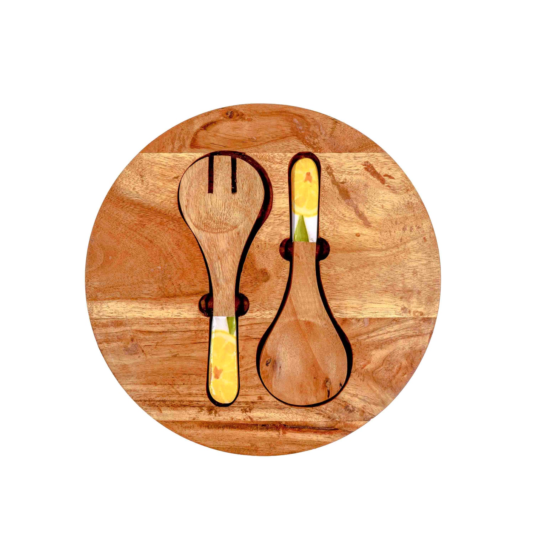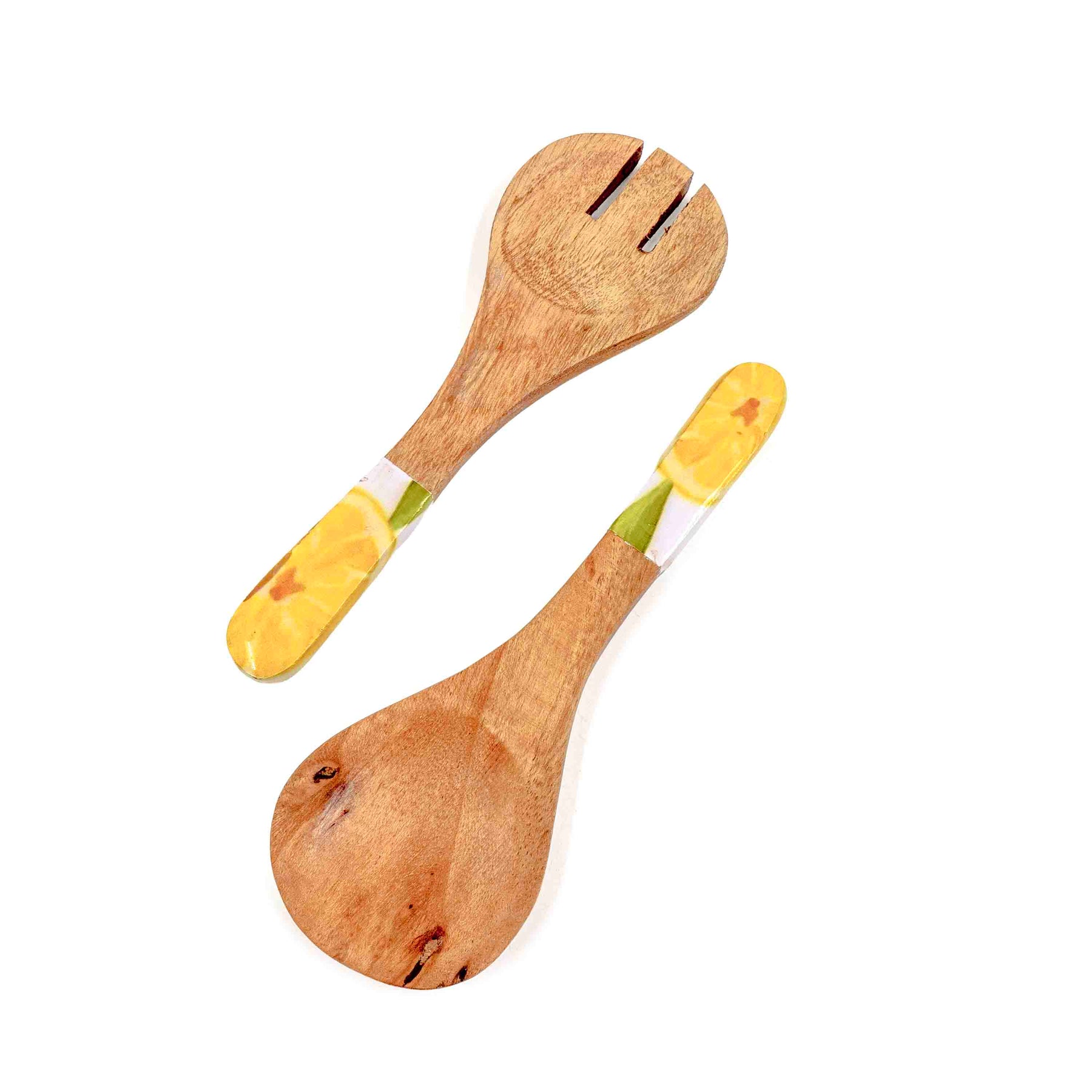 Crafted from rich acacia wood and paired with hand-enamelled lemon-patterned handles, this salad set is where tropical freshness meets natural warmth. The bowl comes with a matching wooden lid for easy storage, while the coordinated salad servers and cheese spreaders make it perfect for entertaining. A functional yet decorative centrepiece for your dining table.